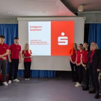 Die Azubis der Sparkasse haben zunächst sich und ihre Ausbildung vorgestellt, dann durften die Schülerinnen und Schüler selbst aktiv werden. In Kleingruppen lösten sie das Gruppenpuzzle zum Thema „was muss in einer Bewerbung stehen“. Das Vorstellungsgespräch wurde in einem Rollenspiel eingeübt und in einem Mini-Einstellungstest konnten die Schülerinnen und Schüler einen Einblick in typische Testfragen bekommen.